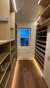 A beépített szekrények belső elrendezése a polcok és fiókok elhelyezésével testreszabható. Ez a megoldás ideális azok számára, akik rendezett és jól strukturált tárolást szeretnének.